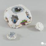Their purpose soon becomes clear. Rather than using the Lowell sphere method to create a ball shape, this model employs clip-and-bar connections to put panels and plates at 45° to each other.