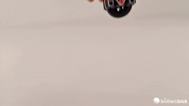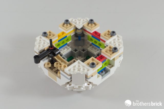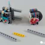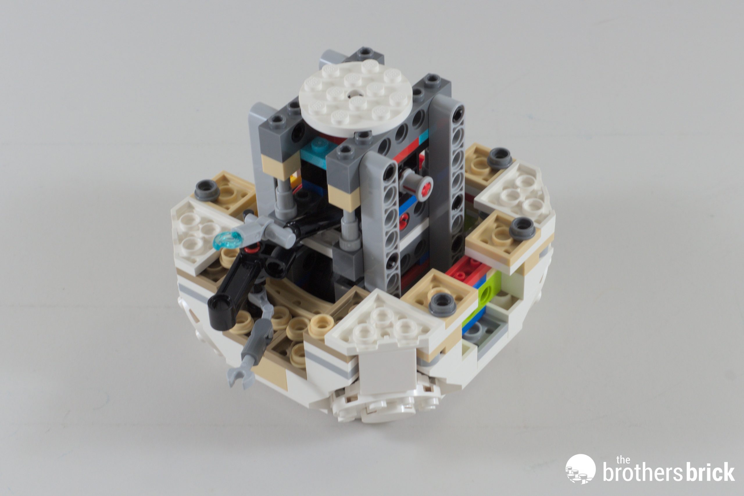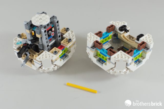 And that means we can connect another half-sphere. It’s a case of same-same, but different. The last part to go in is a Technic axle, which connects to the aforementioned transfer gear.