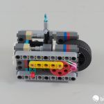So what’s a droid doing with a wheel? Good question. This mechanism will hopefully help us answer that question. The big wheel spins some little ones thanks to some rubber bands (and Technic half-bushes in pink, unusually)…