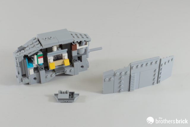 It’s a densely packed belly. So much so that some interesting techniques are required to get the external panels to fit properly. On the front we have a 1×2 panel creating a gap for the amour plating to sit in. On the back, it’s a recessed clip attached sideways.