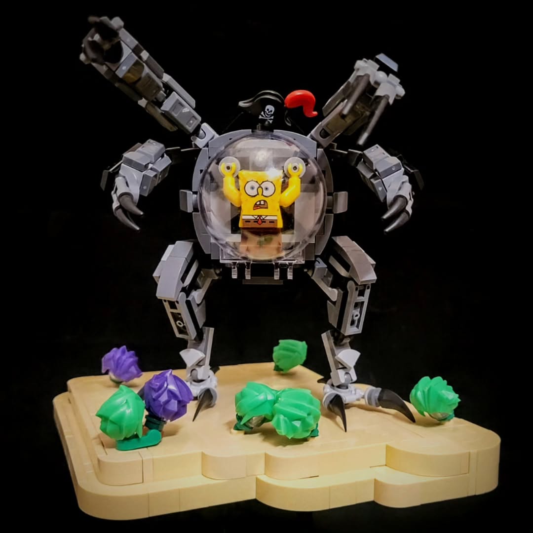Scrolling through the creations of Thorben (tee_baum_bricks) is like a glimpse into a nerdy LEGO fan’s fever dreams. It’s a place where Saturday morning cartoons and eldritch horror meet over a slice of pizza. This year, Thorben has created a series of mechs and super soldiers based on family-friendly game and cartoon characters. This SpongeBob mech first grabbed my attention (with those sick clawed arms). In Thorben’s world, the absorbent power of sponges aid pirates in their undersea invasion. Poor SpongeBob, trapped inside this infernal machine.
