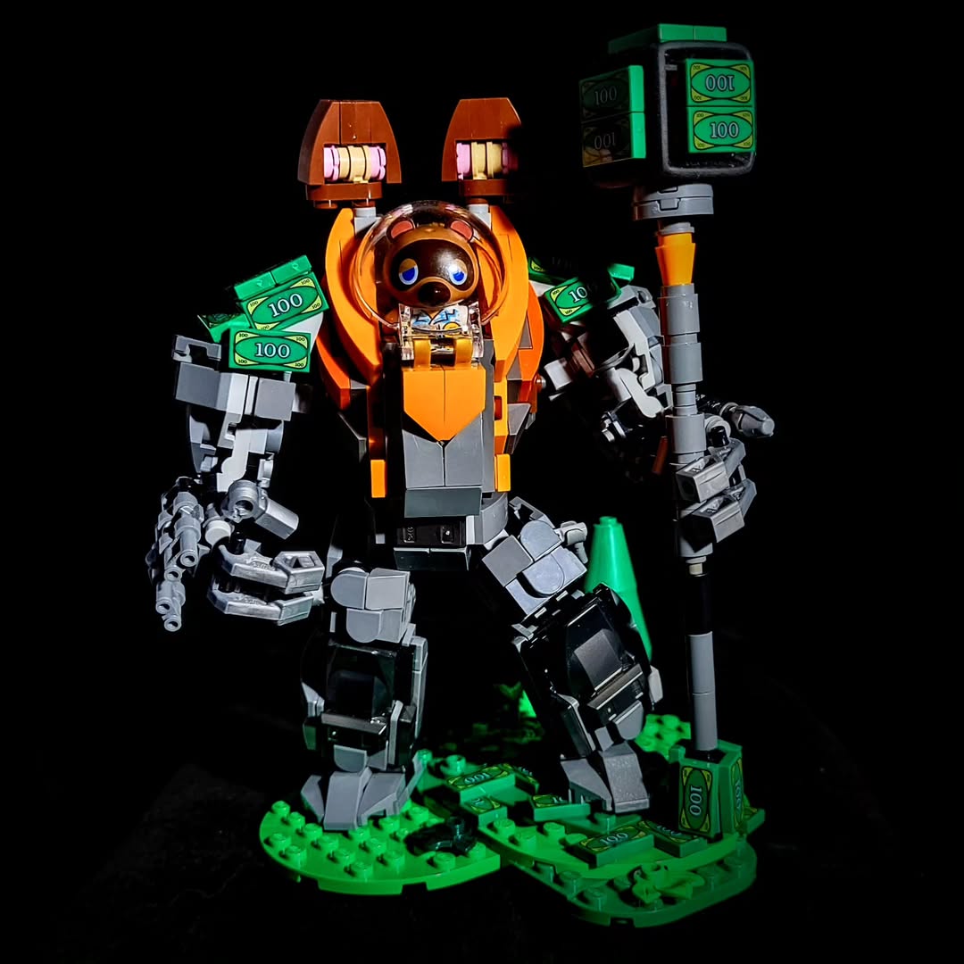 Tom Nook is notoriously eager to force loans on people that they have to pay back through cozy servitude. It’s only natural that the mech extension of his scheming would involve a money hammer to bury enemies in bells that must be paid back with interest. Great use of a dice element for the hammer.