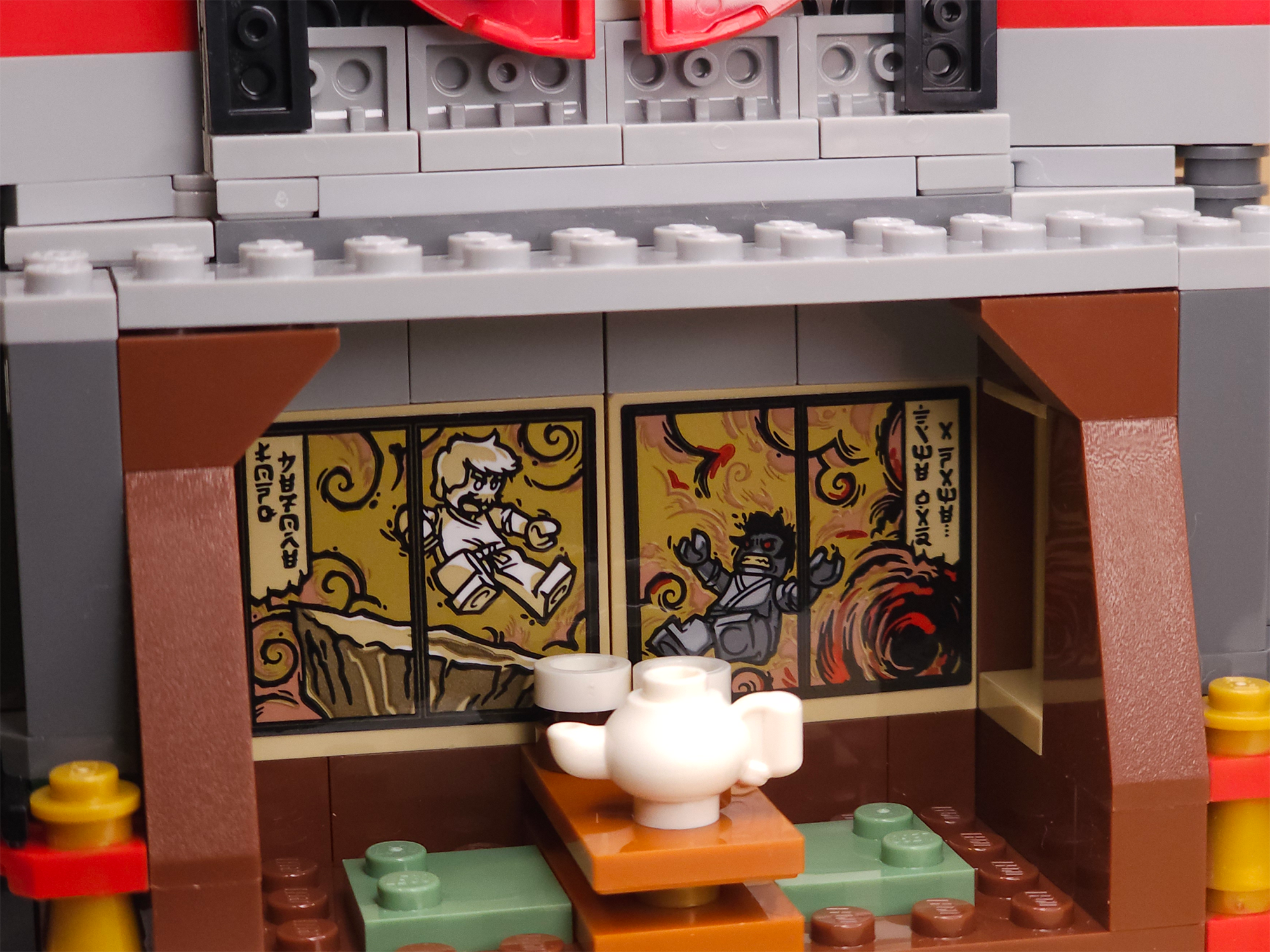 The centerpiece of the set is the entrance to the ninja’s home – the Monastery of Spinjitzu’s main gate, and it’s designed to display the whole crew. The gate has two hinged doors and a small interior room in its base, with some nice lore-driven details.