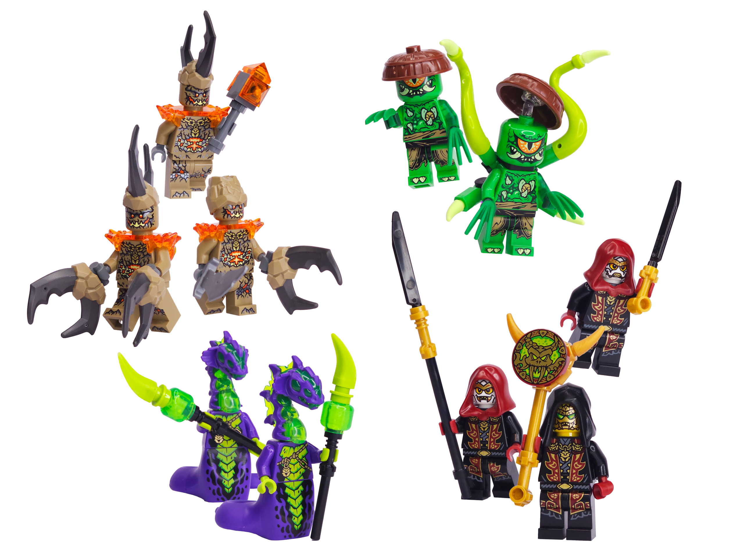 Starting at the image’s top left and moving clockwise, we first get the Earth Monsters. Creatures formed of molten magma, rock, and metal, with some fantastic printing to show it, including some metallic silver detailing. There are three variations that we see, all built around the same base figure. The new pincer accessory looks like a fusion of rock and metal, and the shoulder armor is a new trans-orange color of the “crystal shards” armor that we’ve been seeing in the more recent Ninjago sets – and, as mentioned earlier, the cracked rock headgear also appears in a new dark tan color.