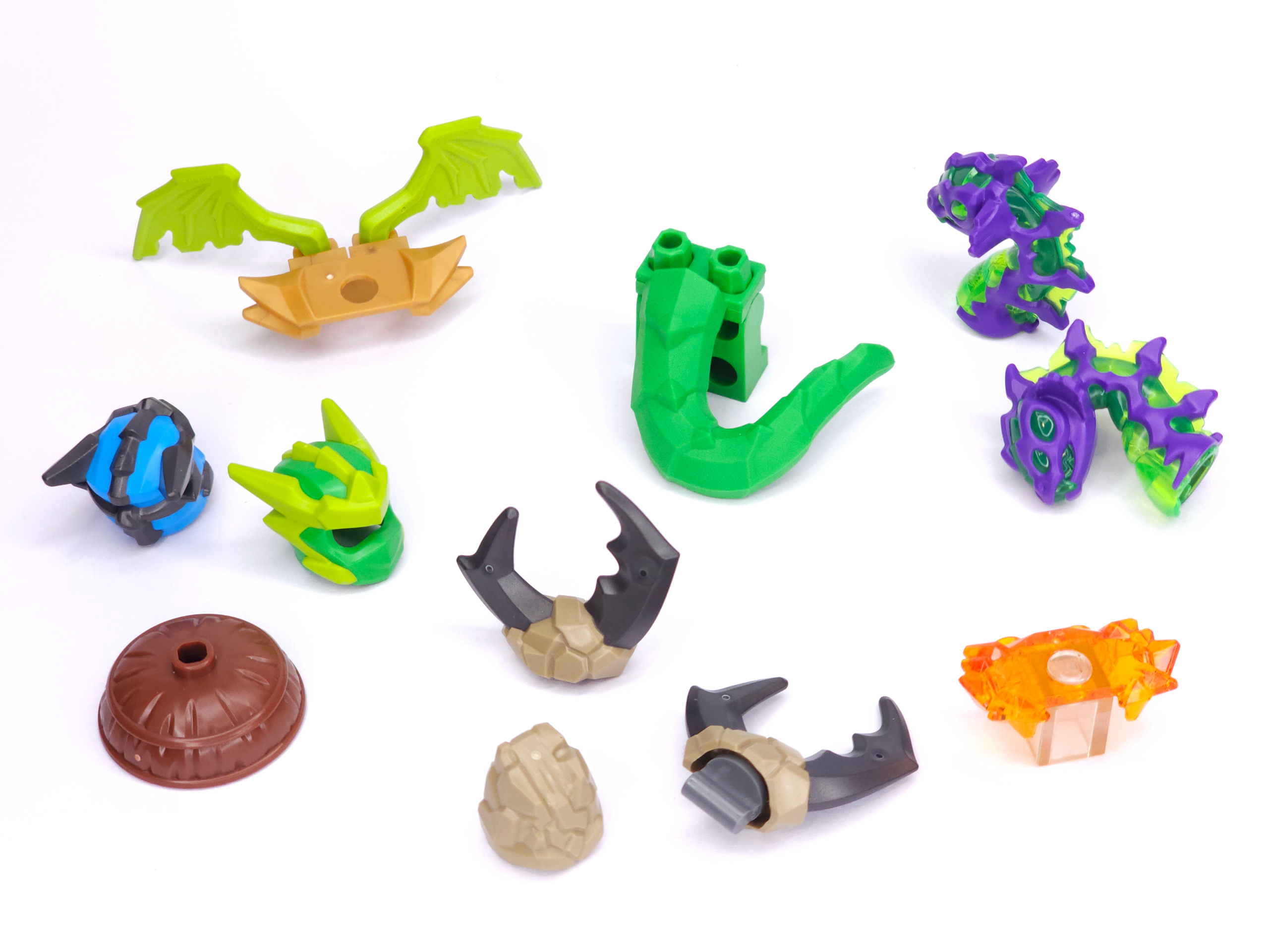 Lastly – the Acid Monsters, and with them is the return of the snake bodies. They appear in multiple sets with only one variation. The printing and details are top-notch and the dual-molded purple and trans-bright green snake heads are very eye-catching. It’s a good thing these guys look so visually striking, because they don’t have much more to offer, with super stylized pieces that will undoubtedly be hard to mix and match elsewhere.