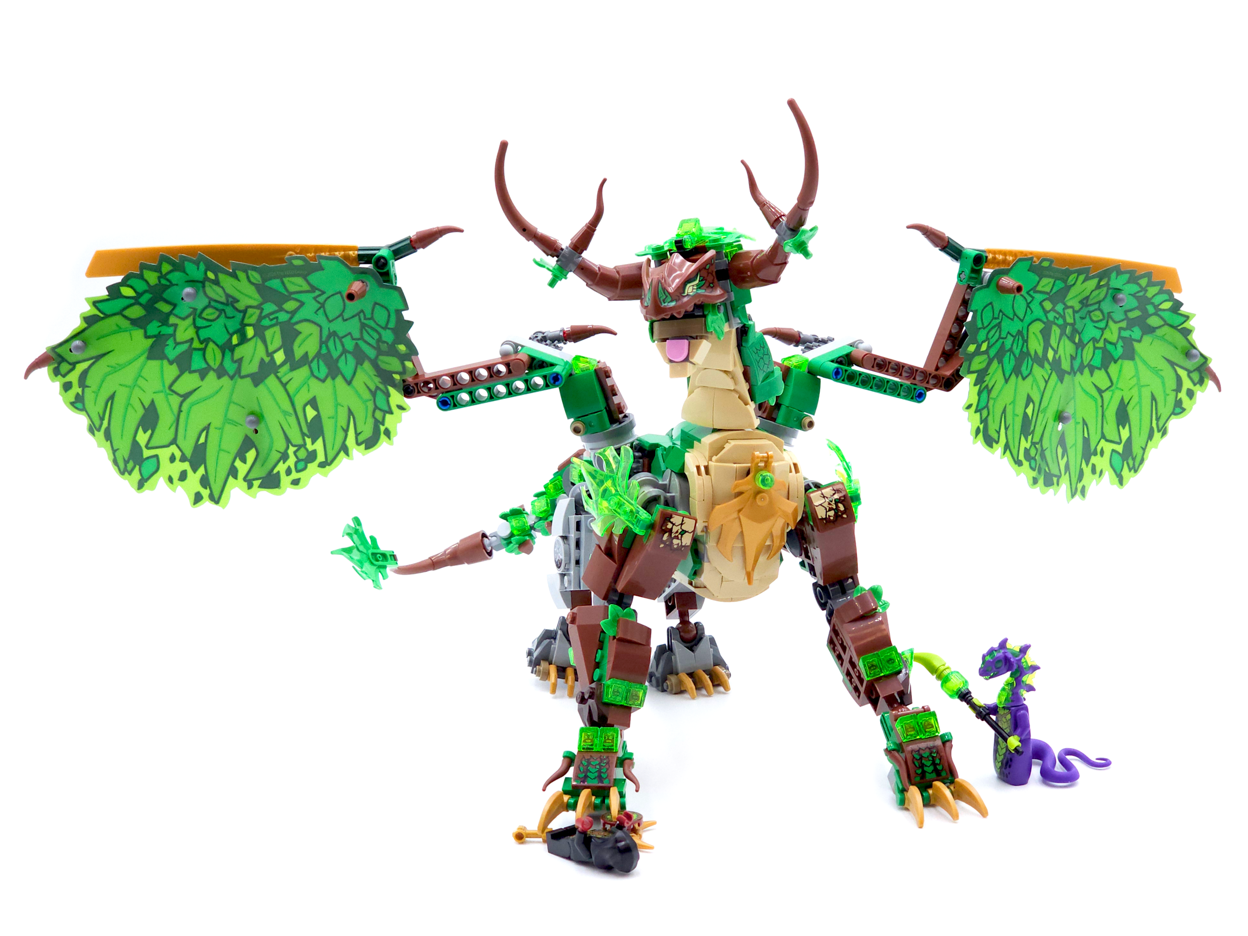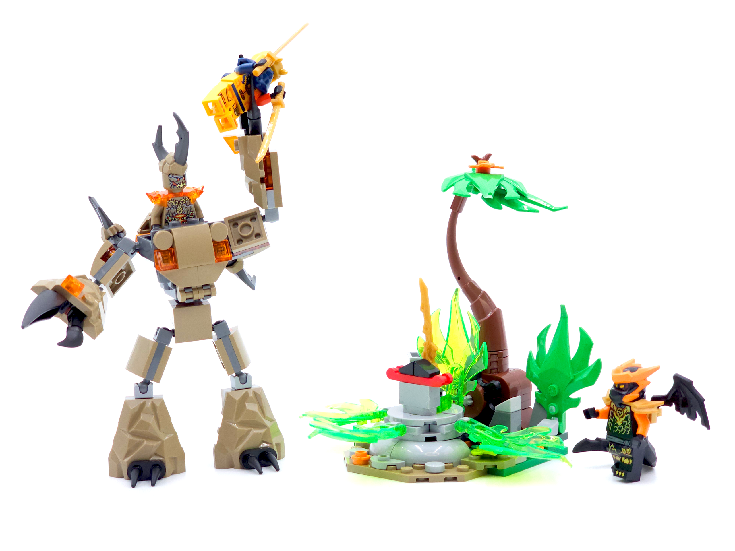 The set also includes a smaller build featuring the Dragon Sword, aka Sword of Fire, encased in trans–bright green flames (leaves?) – a neat new piece that appears throughout the wave. The tree incorporates a gear mechanism that spins the sword’s platform and flames. We also get a small Earth Monster mech that adds a nice balance to the set, but not a whole lot more.