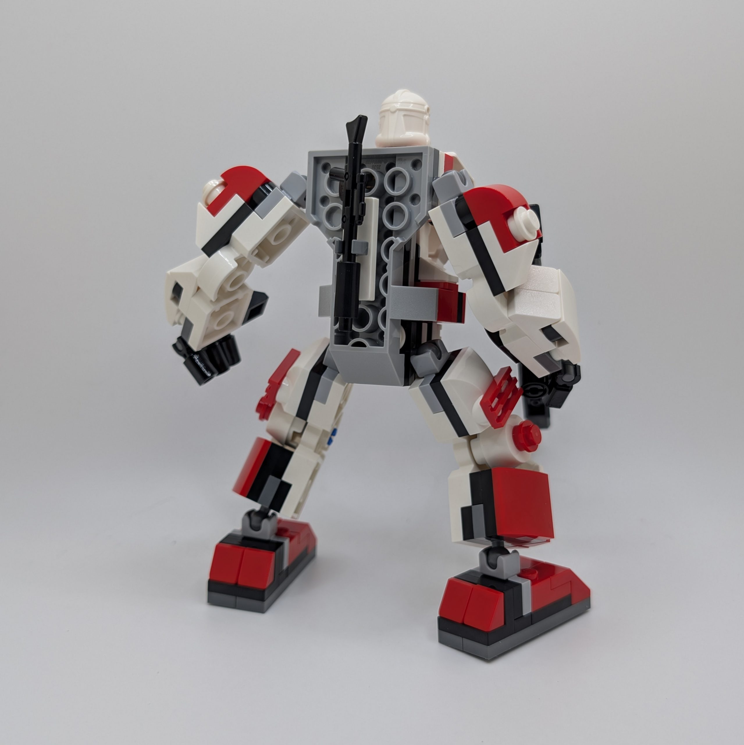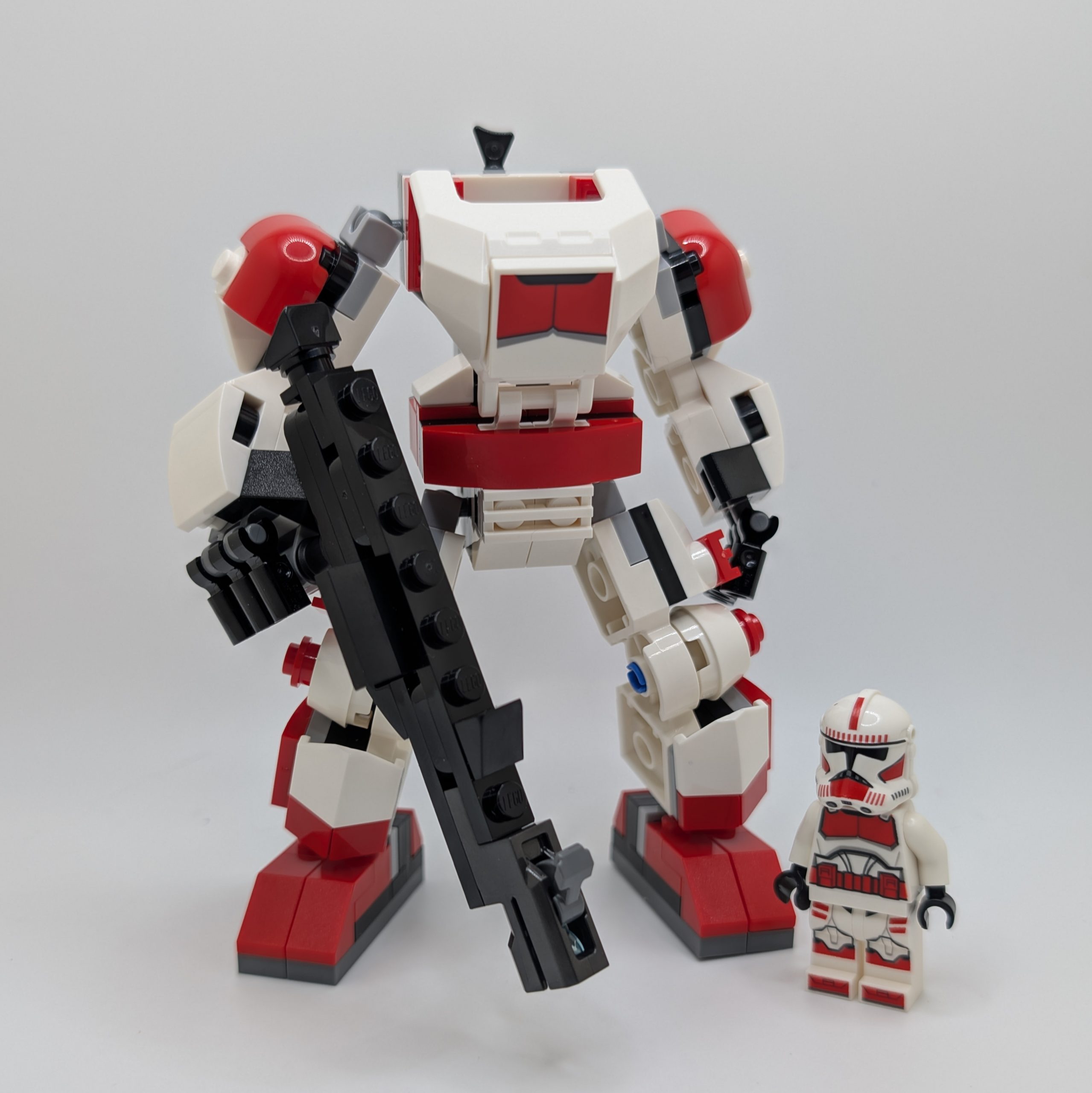That being said, the completed mech looks quite good. The red highlights match the Shock Trooper’s armor nicely, and the printed chest plate tile is a welcome detail that helps the mech feel more intentional and less generic. The mech’s blaster is clearly meant to evoke the shape of a clone trooper’s rifle, though the proportions feel a bit off and the shaping comes across as slightly wonky. The stud shooter attached to the end functions well as a play feature, but visually it does not blend particularly well with the rest of the blaster and gives the weapon a somewhat strange overall look.
