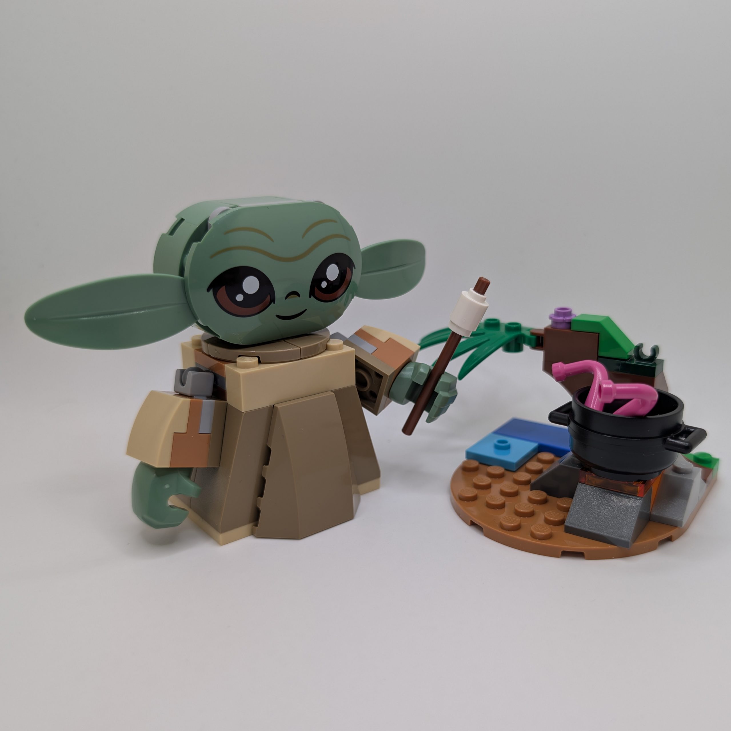 Aimed squarely at younger builders, this set includes a brick built rendition of Grogu himself, along with a frog catapult and a small section of scenery. The environment comes complete with a stew pot full of questionable tentacles, a couple of cookies that can be stored inside Grogu’s chest, and a marshmallow on a stick ready to be roasted over the fire. It is simple, playful, and very clearly designed with imaginative play in mind.