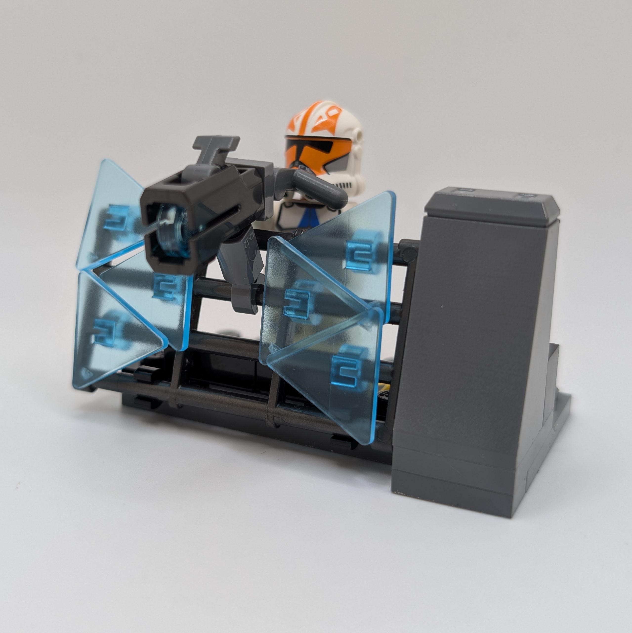 The clones, meanwhile, have assembled a rather questionable static defense barricade. This thing redefines the concept of cover and concealment down to almost nothing. Kamino must have been getting sloppy with training in the later years, because hiding behind what is essentially a screen door seems like a poor tactical choice when facing a group of elite warrior zealots armed to the teeth. That said, the build serves its intended purpose just fine. The clone turret is a fun play feature, and despite the many gaps in their cover, the scene it is trying to convey comes across clearly.