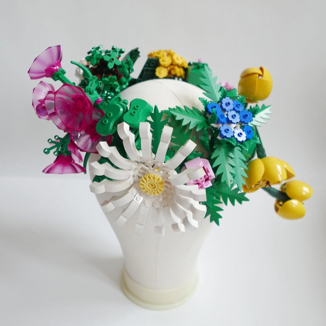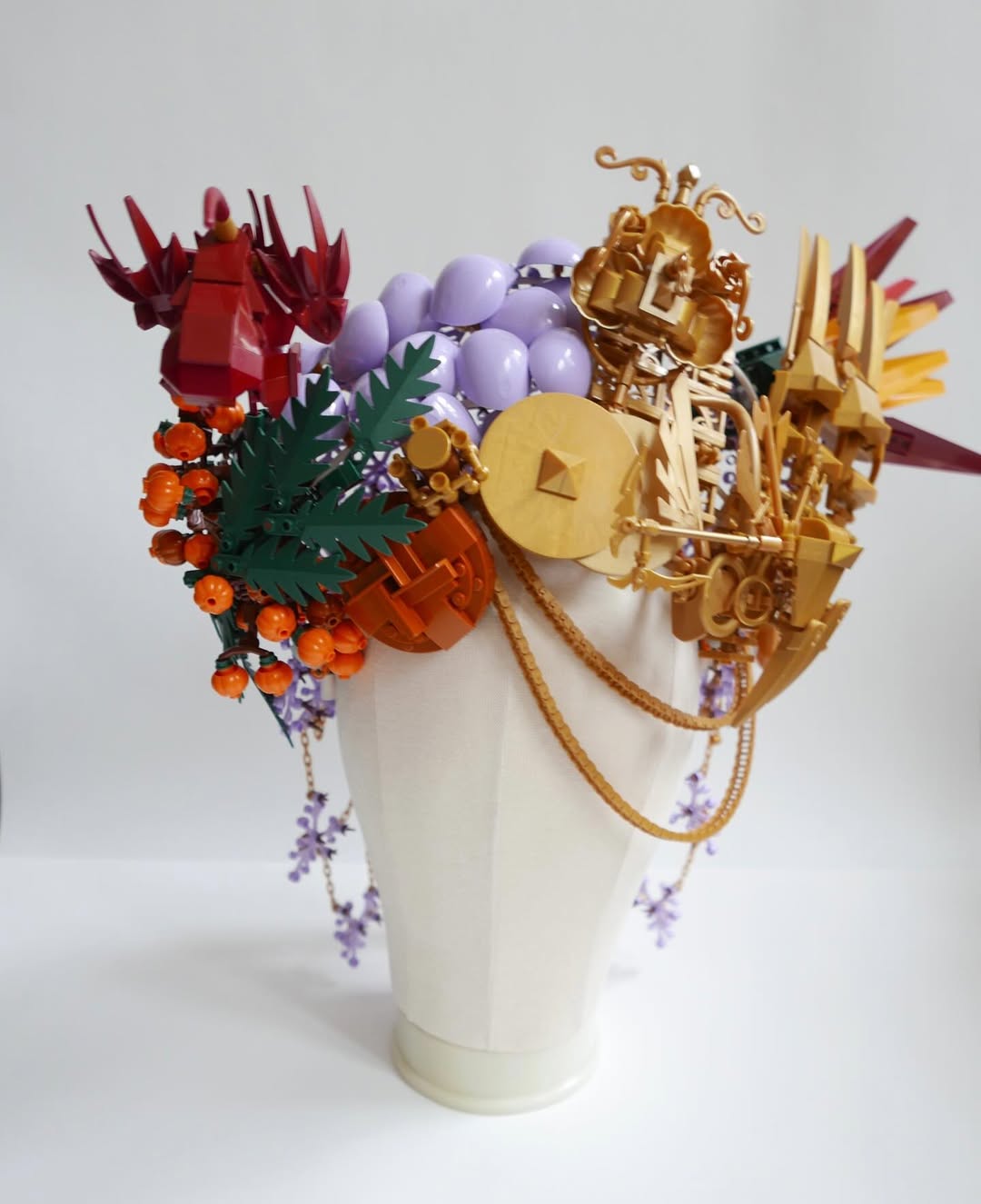 Heidi’s headwear first shone on LEGO Masters Finland where she partnered with Satu Aaltonen, whose work is currently on display in LEGO House’s Masterpiece Gallery. For this bridal-themed headpiece, Heidi led the build while Satu wore it down the runway. I love how elegant the trans-yellow chains become when draping from a floral crown.