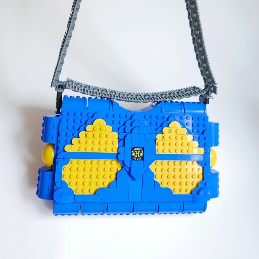 Heidi’s creations aren’t limited to headwear. She’s also created a line of functional clutches, like this Fabuland-inspired bag with a tank tread strap. The Hogwarts H tile makes for a perfect monogram for the artist.