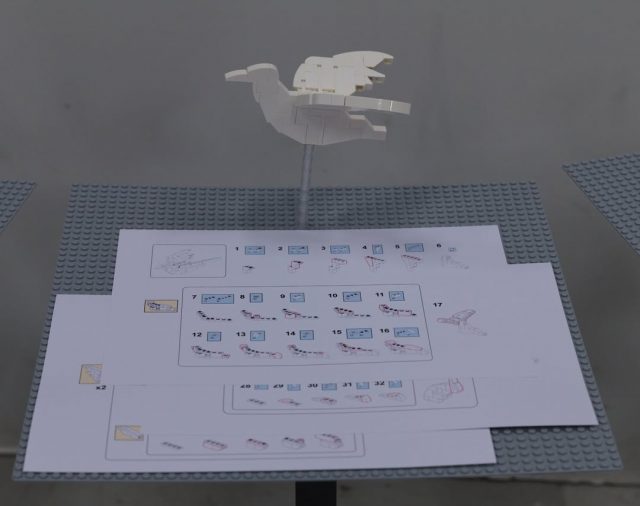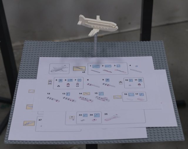 The individual models are made entirely of white bricks and form easily recognizable objects like an airplane or bird.