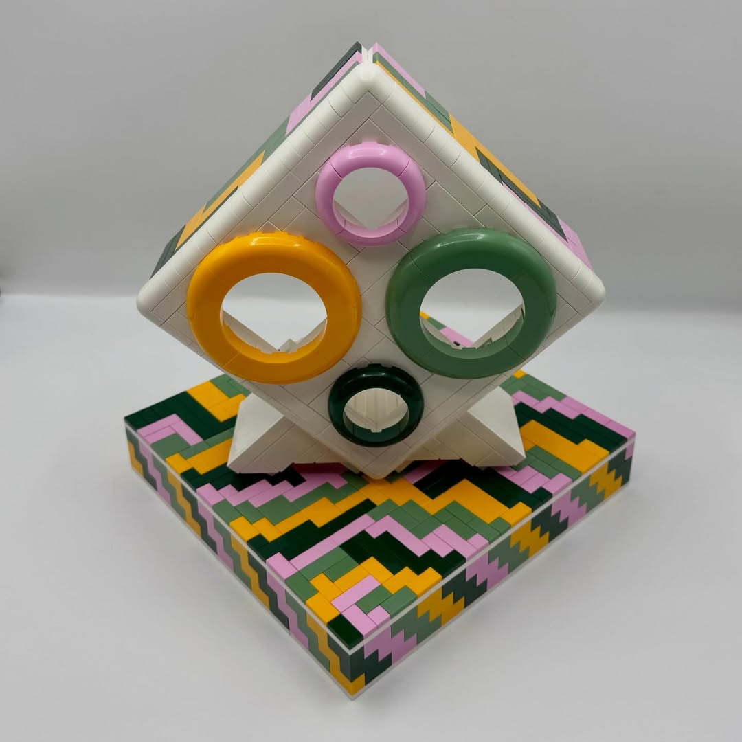 In her LEGO creations, Kat (@klegofan3000) regularly switches between tiled mosaics and modernist architectural creations. For her latest work, Kat blends her skills into an evocative sculpture that contrasts busy zigzagging lines with negative space from round holes. I love the unusual color combination of pink, orange, and green, and how the mosaic pattern wraps down the sides while being gloriously asymmetrical on the top.
