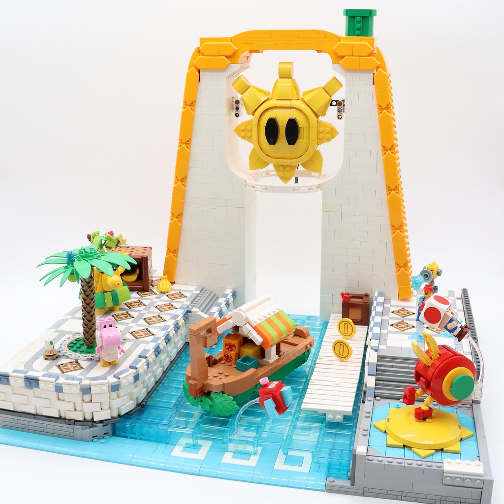 What better place to spend your holiday from the Mushroom Kingdom than Isle Delfino? French builder Clément (issemclem) put together an impressive recreation of the Isle’s Delfino Plaza, bustling with activity and some familiar buildable Mario figures aside some that we haven’t seen before. At the center of the plaza is the massive Shine Gate (now fully cleared of Shadow Mario’s goop), towering over a Pianta plaza that is ripe with detail. A closer look at all of the tile work and detail that went into the foundation is recommended, as you may notice printed tiles from the Rivendell and Fountain Garden sets make an appearance alongside printed parts from the Super Mario sets (like the large coins from the Piranha Plant set).