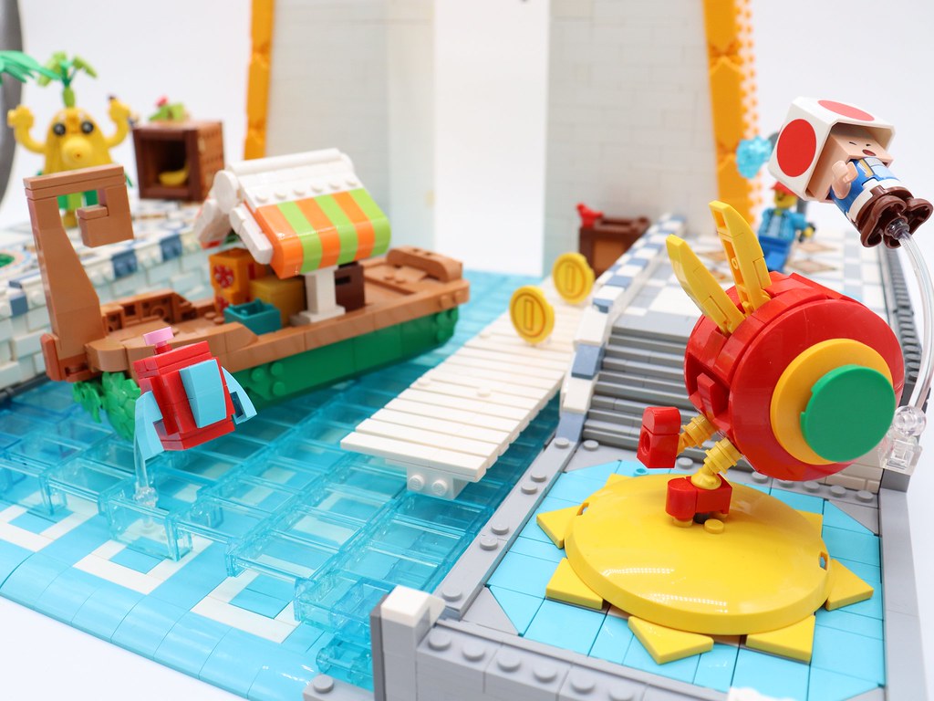 The plaza features some of the buildable Mario figures (like Yoshi and Toad), but also features some new character builds from Clément that feel right at home next to them. Cataquack is featured below, perfectly recreated to launch you to the skies.