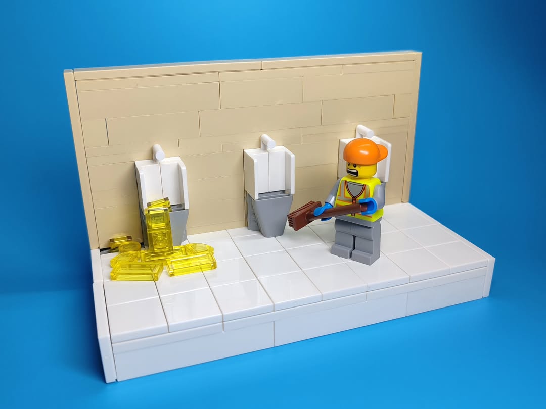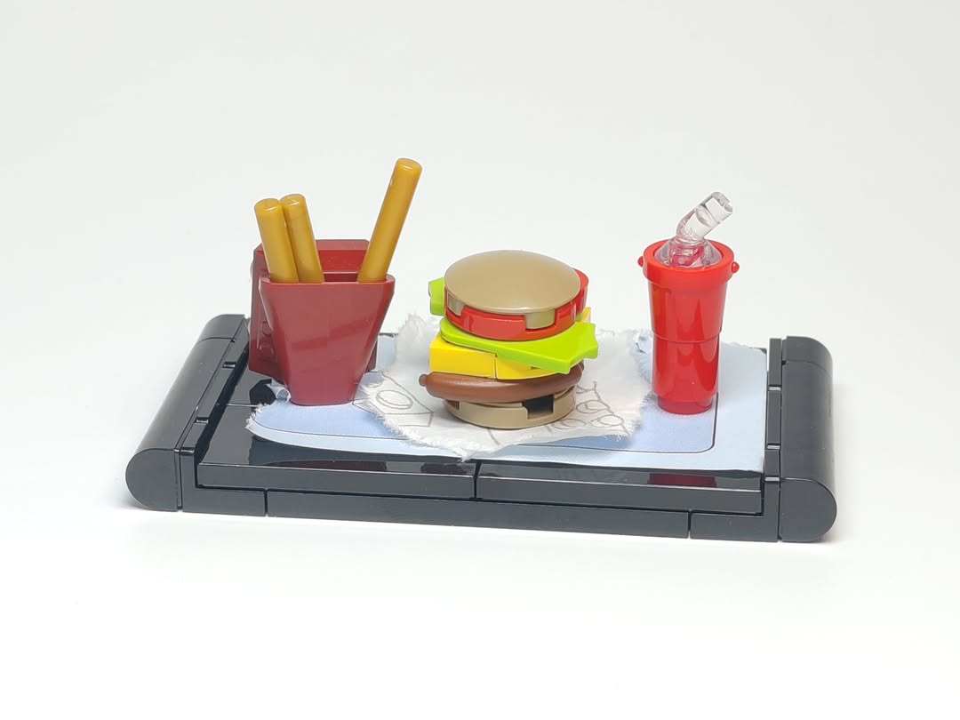 We’re loving this fast food tray with the seed part used to hold golden fries. A torn bag and a piece of an instruction manual add texture to this miniature tableau. This one evokes the miniature food of LEGO Masters winner Ian Summers.