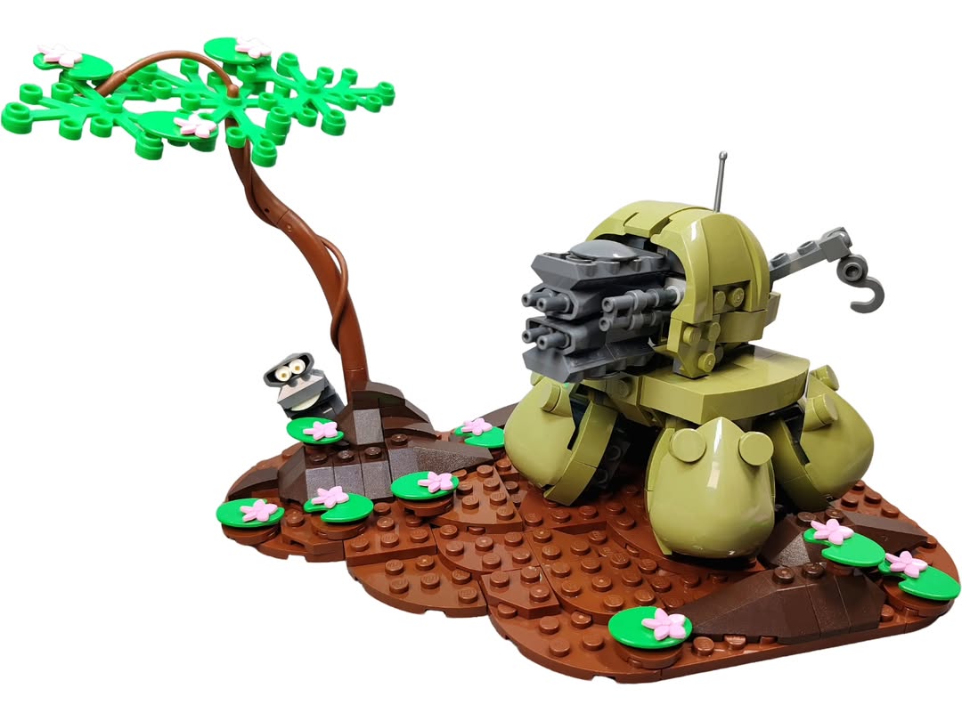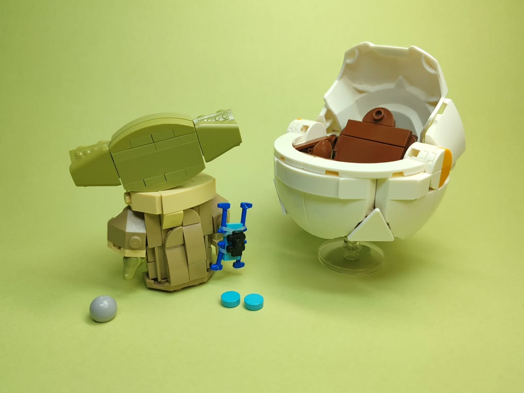 Competing in the Iron Forge isn’t child’s play! Here, the builder not only shows off the seed part as Grogu’s years, but he invents an impressive pram to carry “Baby Yoda.” Using blue antennae for frog legs is my favorite detail.
