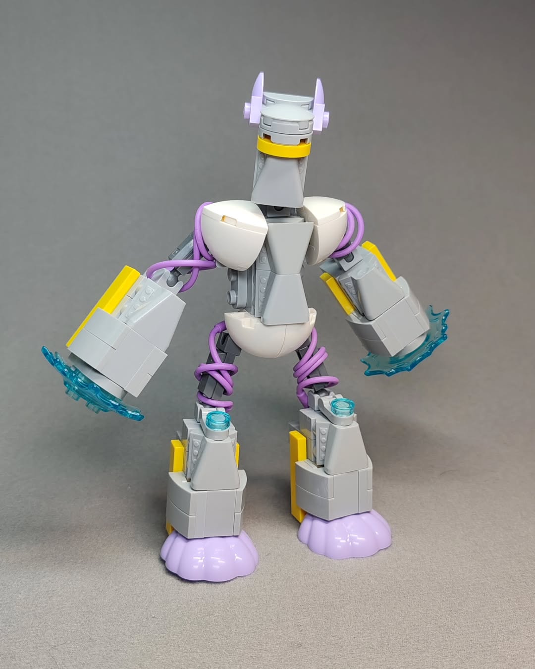 Xiheng brings out the emotive quality of the intake engines, using them as eyes for this adorable WALL-E. Supplementing the main build, an engine in brown doubles as the bot’s boot-turned-planter. In Iron Forge tradition, this creation incorporates both seed elements from the previous rounds – the eggshell/crown and the minifig chair.