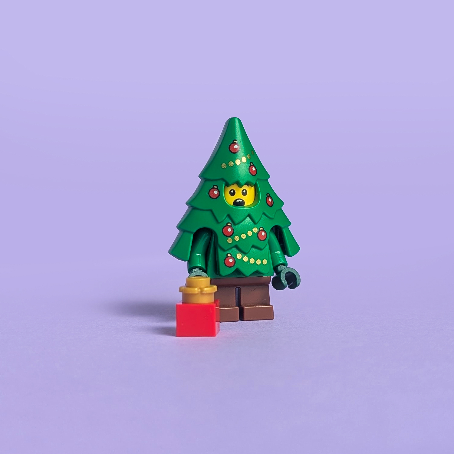 Bones: The crown jewel of this calendar, this new Christmas tree costume is gorgeous with its little printed red and gold baubles. I’m not showing it here, but it isn’t printed on the back, which I actually think is a good thing, making it a bit more versatile for mocs as just a plain tree.