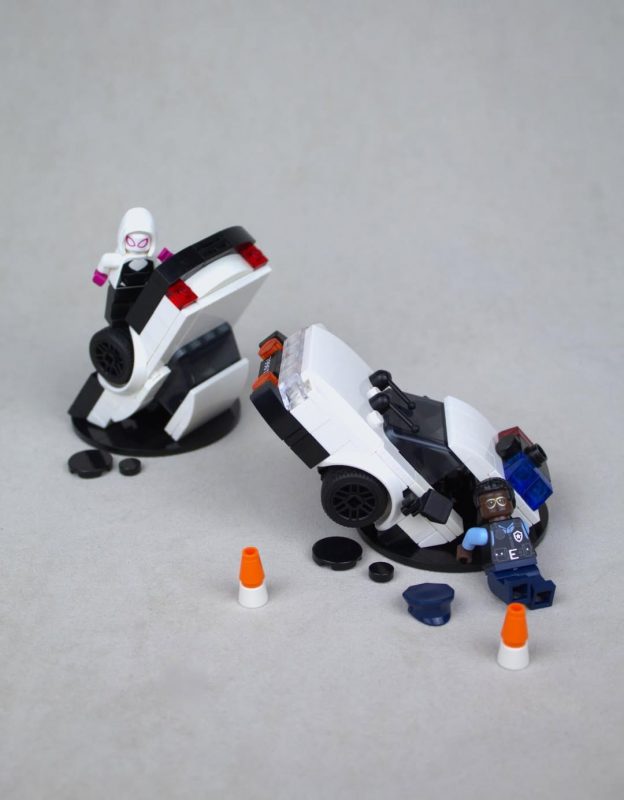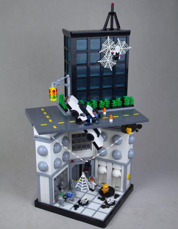 LEGO’s modular nature is put to perfect use here, with multiple props and scene participants taking up space in different parts of the build. The Spot’s trademark black voids being built around minifigure halves and the police car create a kind of unity from their disassembly.