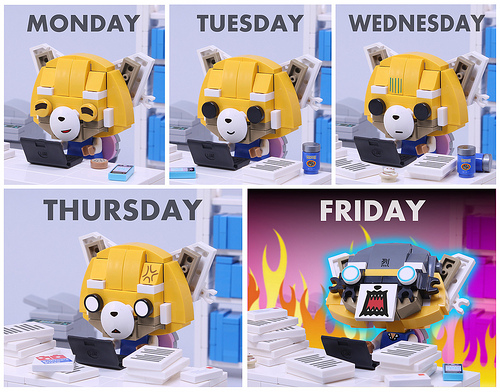 Originally aired as a series of shorts on Japanese television, the adventures of Retsuko have finally arrived on Western shores in the form of a Netflix original series. Taking inspiration from this unexpectedly kawaii take on the modern condition, I decided to try and capture Retsuko’s struggle using LEGO bricks: