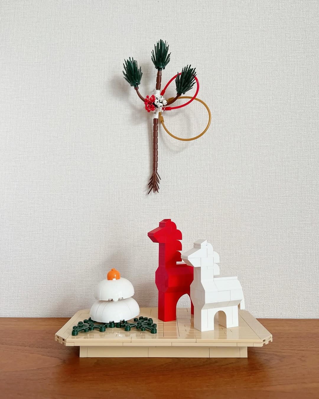 Japanese builder umemaruko uses LEGO to charming effect as part of seasonal decor and holiday traditions (we previously covered her beautiful fall collection). To usher in the Year of the Horse, the builder presents a trio of models. Hanging on the wall is a Nehiki Matsu, a pine sprig charm that is a precursor to the kadomatsu traditional display, where the items symbolize wishes for the new year. Umemaruko’s wishes for the year: to stay grounded and to keep growing! Also in the display, a pair of horses inspired by Swedish Dala horse wood carvings and a kagami mochi – mochi with stacked with dried persimmon. Traditionally, the branch would be burned and the mochi eaten, but I hope umemaruko still has good fortune even if these bricks don’t meet that fate.