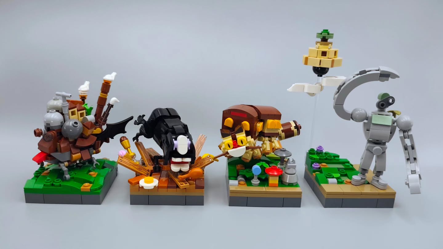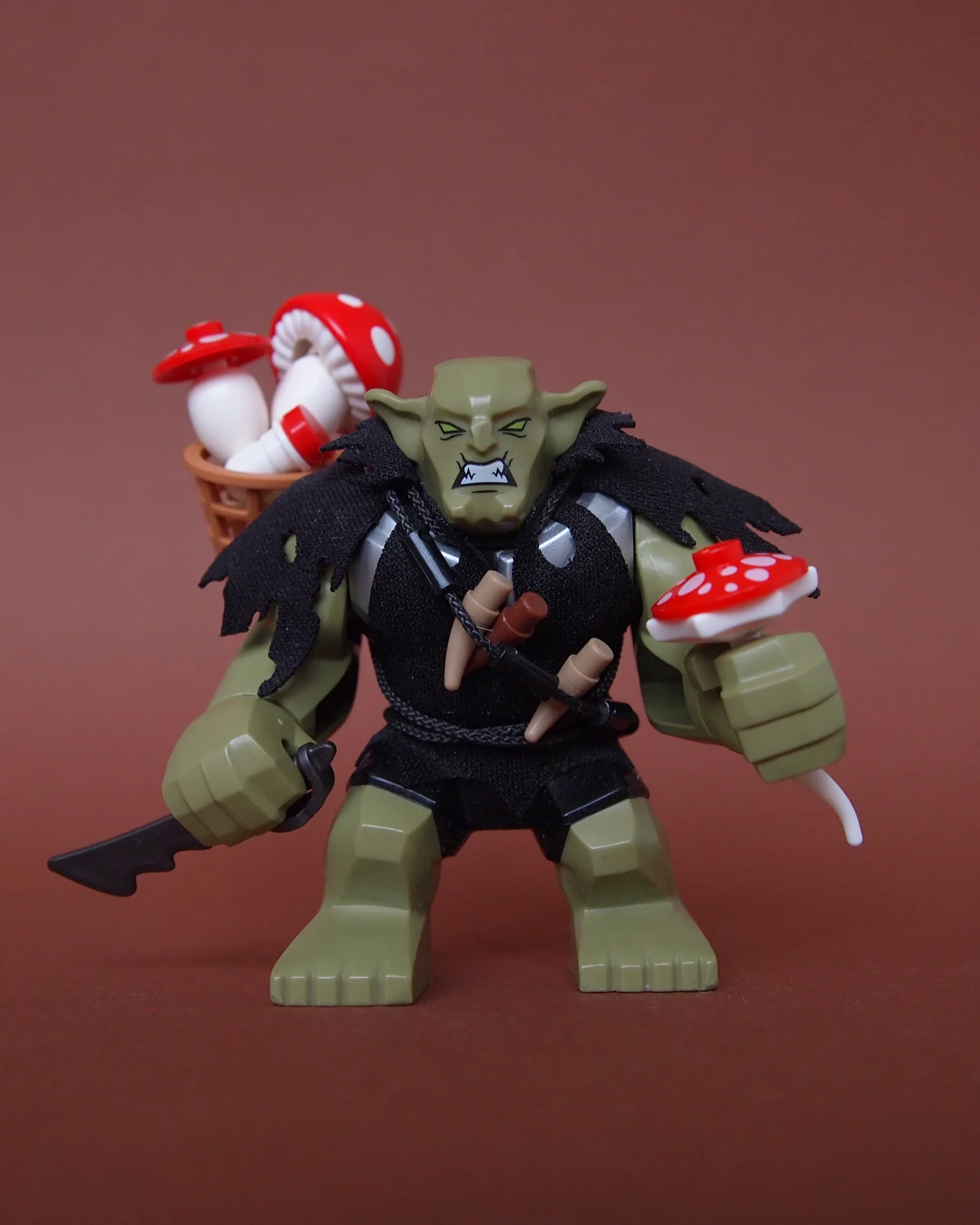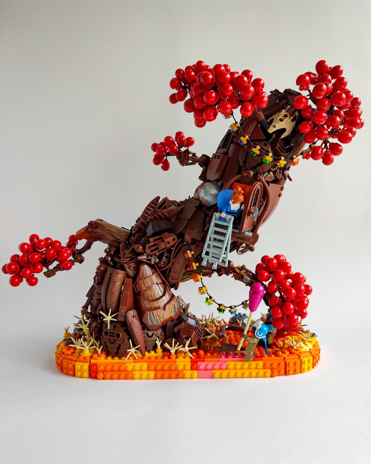 A second build also showcases Niina’s incredible talent for creating organic forms from irregular parts. This time the trunk incorporates incorporates a mix of Bionicle, constraction, and System parts in brown. The berry-like foliage, made from red helmets, adds a dose of whimsy to this scene where the tree’s resident is greeted by a friend or suitor.