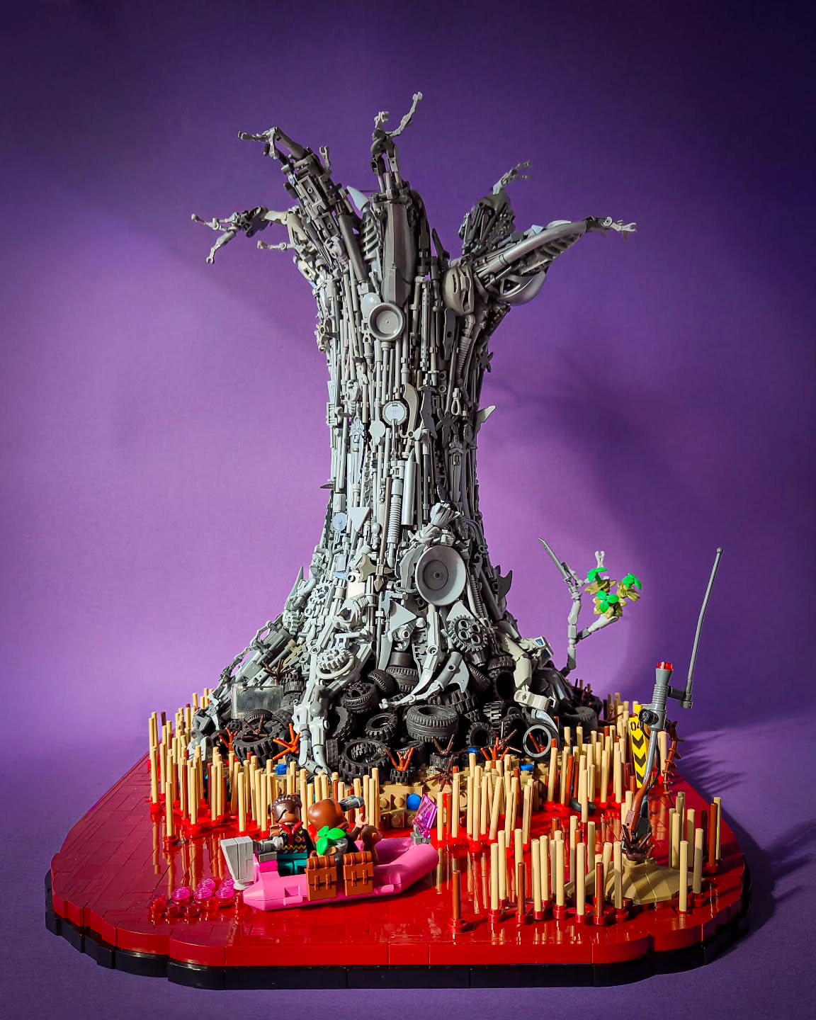 There are few subjects I enjoy seeing in LEGO as much as trees, from the single-mold pine trees in vintage sets to the enormous redwoods of Sequoia Tree Trail. I never cease to be amazed by the creative ways that AFOLs find to make decidedly organic branches and bark out of plastic bricks. At Skærbæk fan weekend, a pair of builds from Finnish builder Niina L show just how evocative a LEGO tree can be. First up is this incredible iron tree with a greeble trunk sitting atop a pile of tires and surrounded by blood-red water. It’s a glimpse of a dystopian world where green has been all but forgotten. A lone sprouting branch offers hope in this dead world.