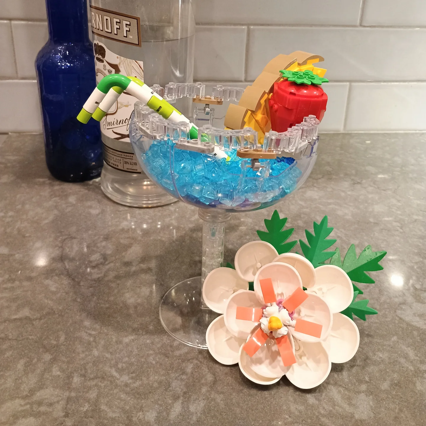 I’m pretty sure I’ll be inviting TBB’s own Visual Assets Specialist, Kimberly Giffen to my next siorée. Not only can she edit photos like a dream but she has proven to be one creative mixologist that has shaken things up with a LEGO twist. A rainy weekend, which tracks here in the Pacific Northwest, has inspired her to build a colorful tropical drink. Is it a Blue Lagoon or a Blue Hawaiian? It doesn’t matter as both tastes like plastic and will likely chip your teeth. But it will still look great in your hand while you pontificate with party guests over whether Martin Denny or Les Baxter is the better Exotica Lounge musician. Bottoms up, sailor!