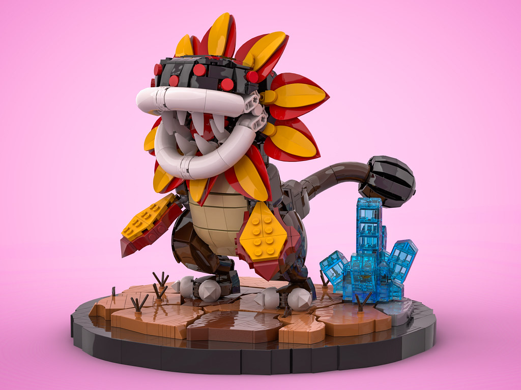 The 2×2 round brick tube (part 65473) has proven to be the most essential piece for Super Mario builds, and is predominantly featured on sets like The Mighty Bowser, the Spiny Shell, and the Piranha Plant. Sakiya used the same part here in different colors to capture the mouth and tail of the Dino Piranha, which looks right at home next to the official sets. We especially appreciate the use of some newer leaf molds I\on the Fiery Dino Piranha to round out their scorching hot ‘mane’.