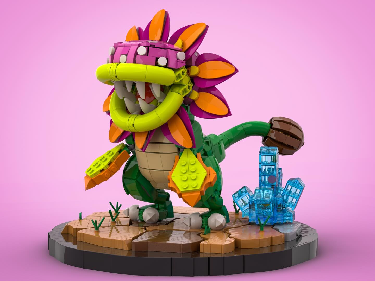 Sakiya also shared an alternate color of this build to represent the base Dino Piranha that is first encountered in the Good Egg Galaxy. The Mario galaxy crystal resembling a LEGO rock 1×1 crystal in both builds is such an excellent touch.