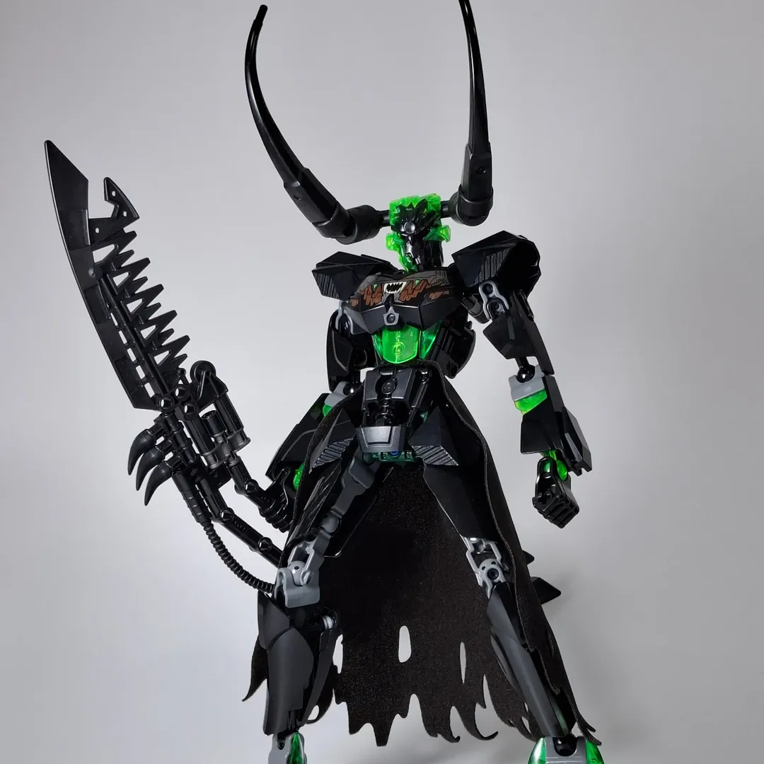 Standing in sharp contrast is Umarak the Hunter, wearing the Mask of Shadows. This character did have an official figure, but it was nowhere near as intense as Gre’s interpretation. The builder keeps the original’s trans green elements, but shifts to all black armor that incorporates armor pieces from post-Bionicle Constraction figs. My favorite feature is the horns that bring big Tim Curry in Legend energy.